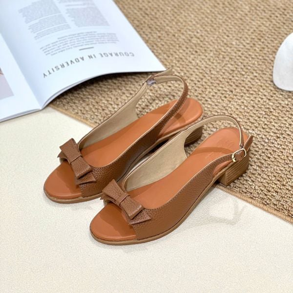 Sandal da 3cm gót vuông vân gỗ mũi tròn quai khuyết giữa gắn nơ liền hậu khóa - MS: S3-01023