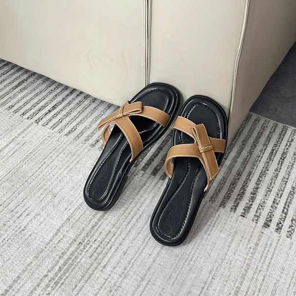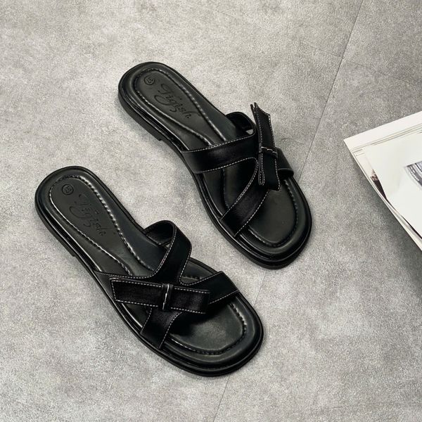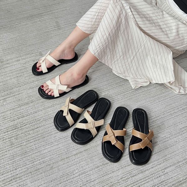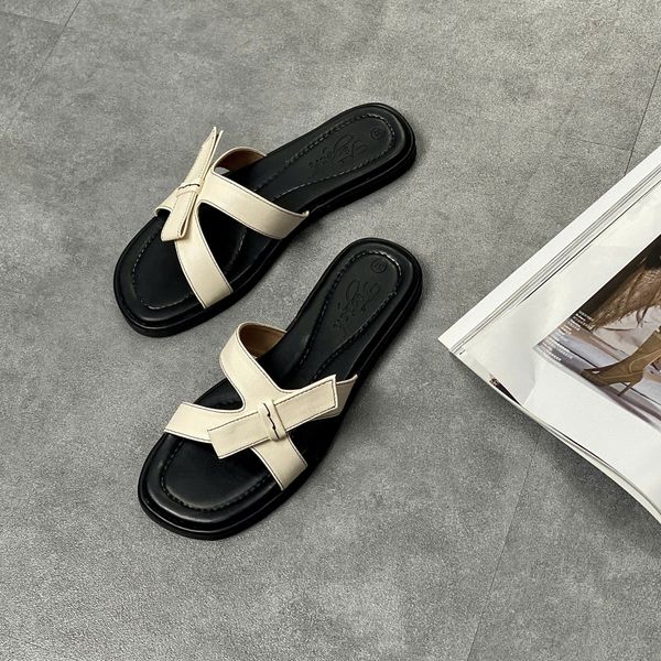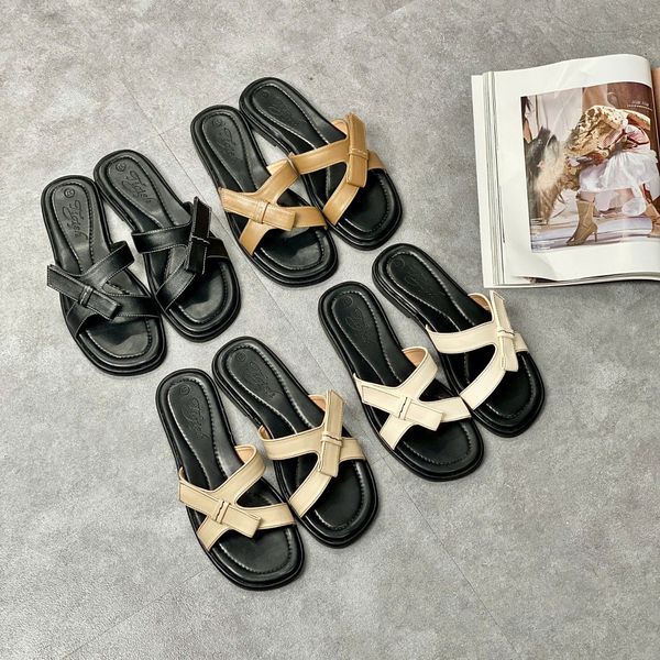 Dép xẹp mũi vuông quai khoét eo gắn nơ xéo - MS: DX-25094